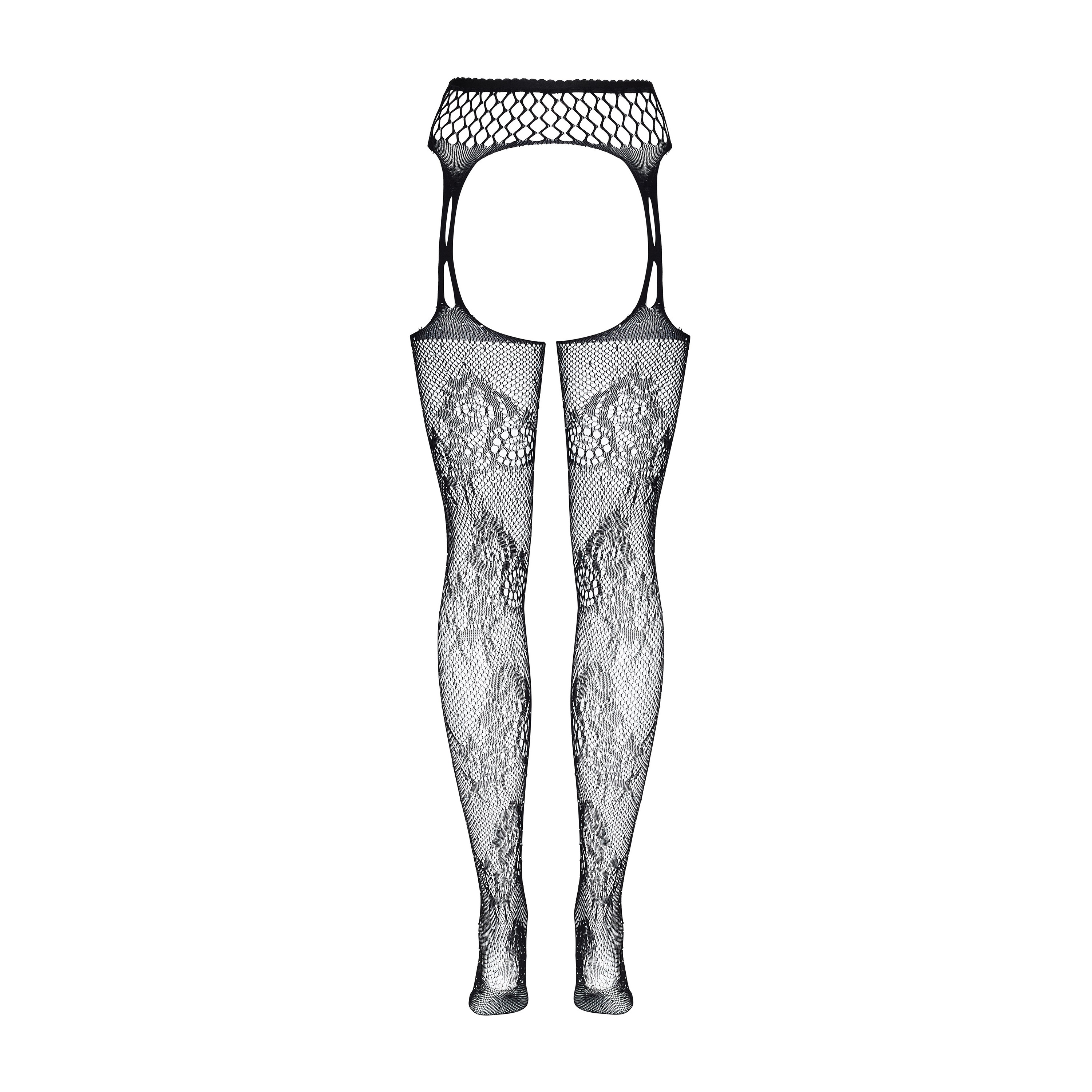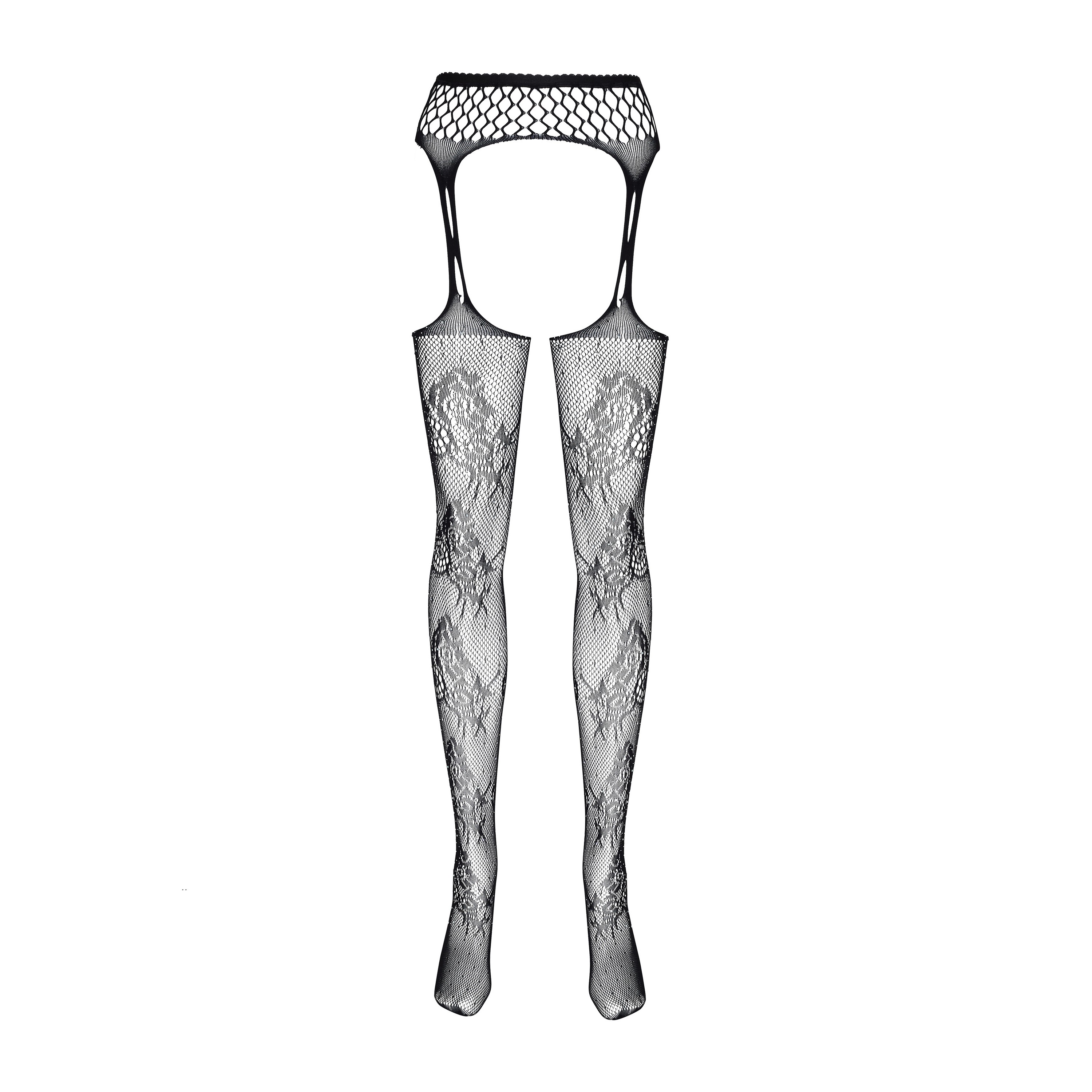 Black fishnet stockings combined with a belt. They have a floral pattern on the front and back and "crystals" of various sizes scattered throughout.