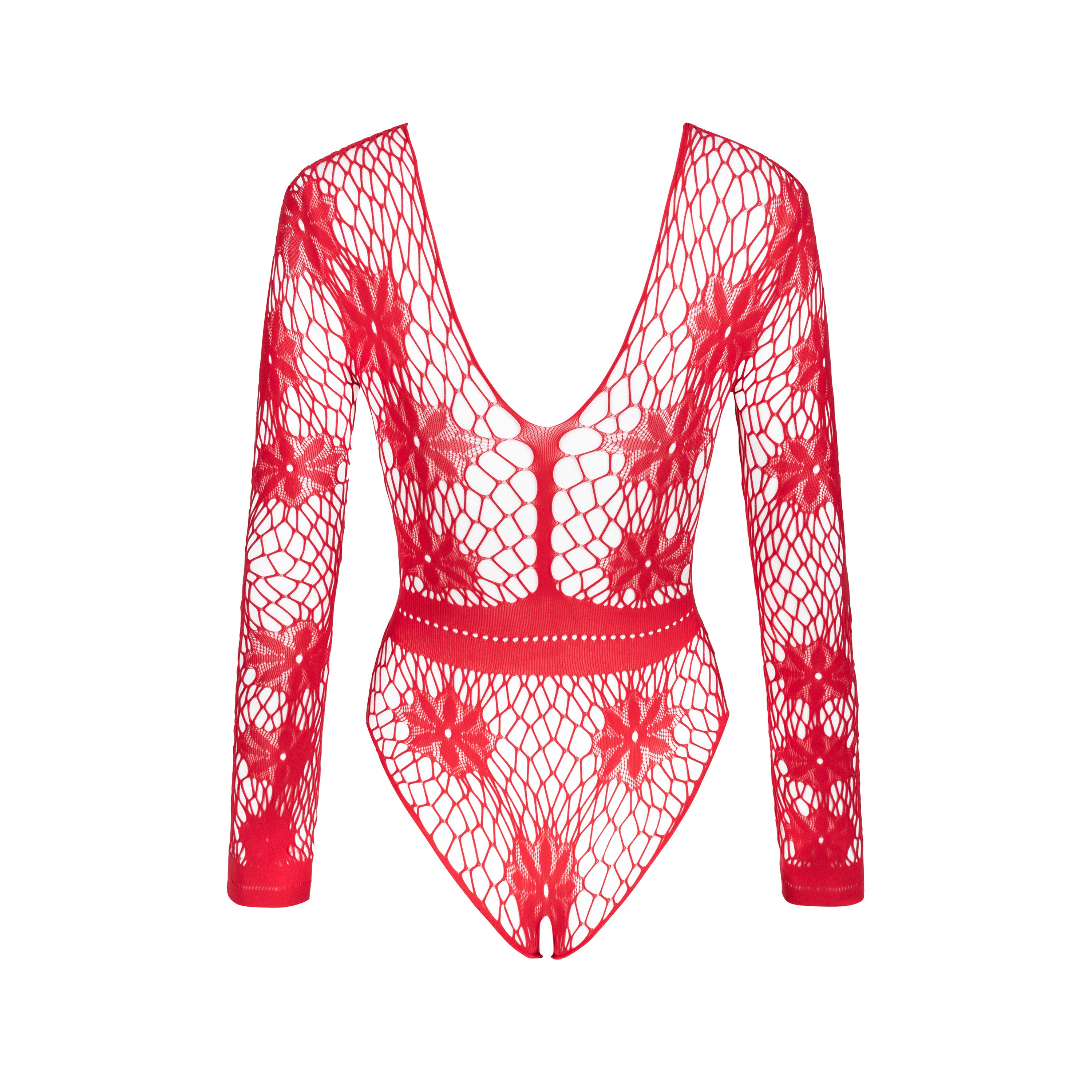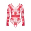 Discover the sensual charm of the Regina red bodysuit, which combines elegance and sex appeal. Made from red mesh, this bodysuit features an intriguing floral pattern that adds a unique allure. The long sleeves and deep back neckline make this model exceptionally seductive yet elegant.