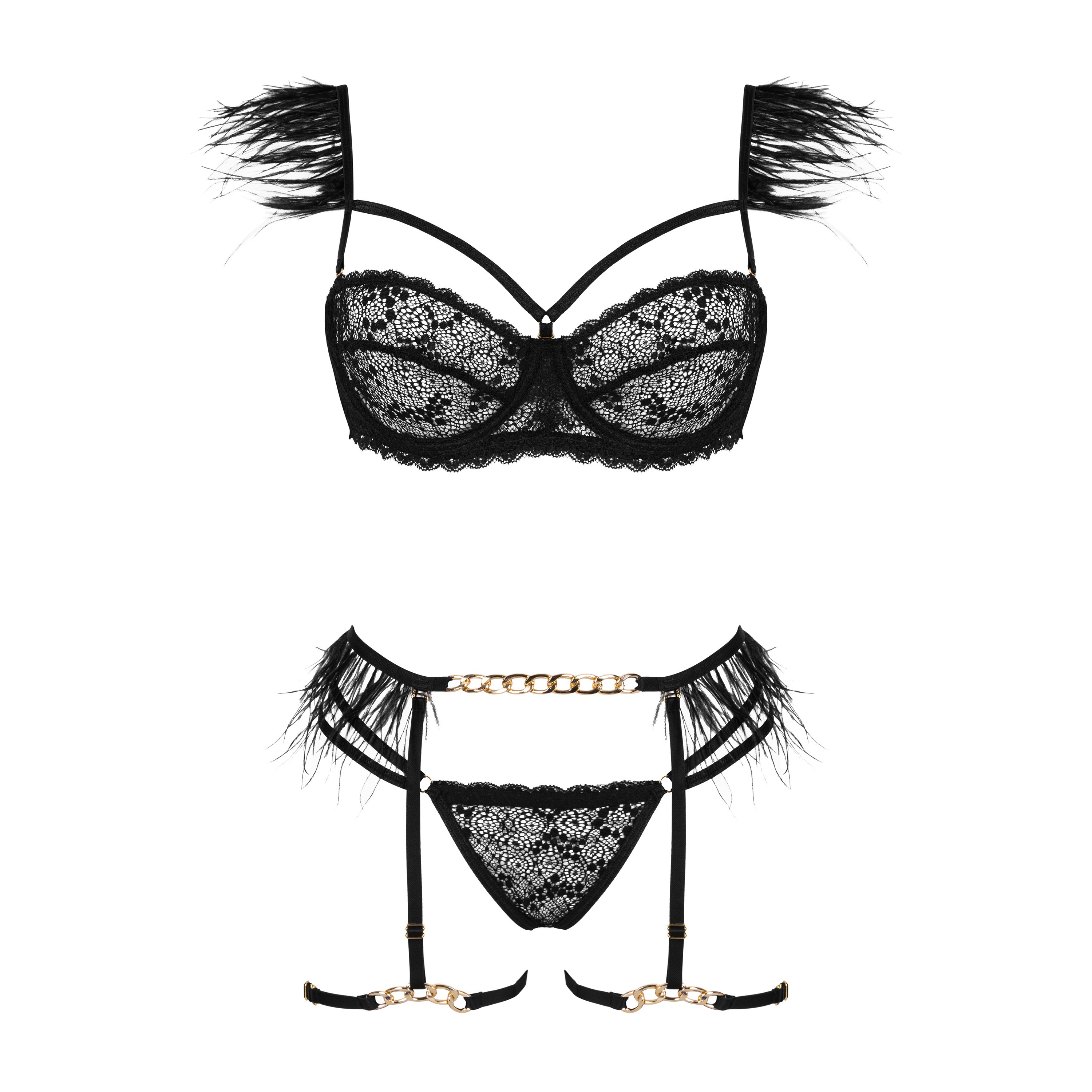 Crystal Black es un lujoso conjunto de lencería para ocasiones especiales, compuesto por cuatro piezas.
