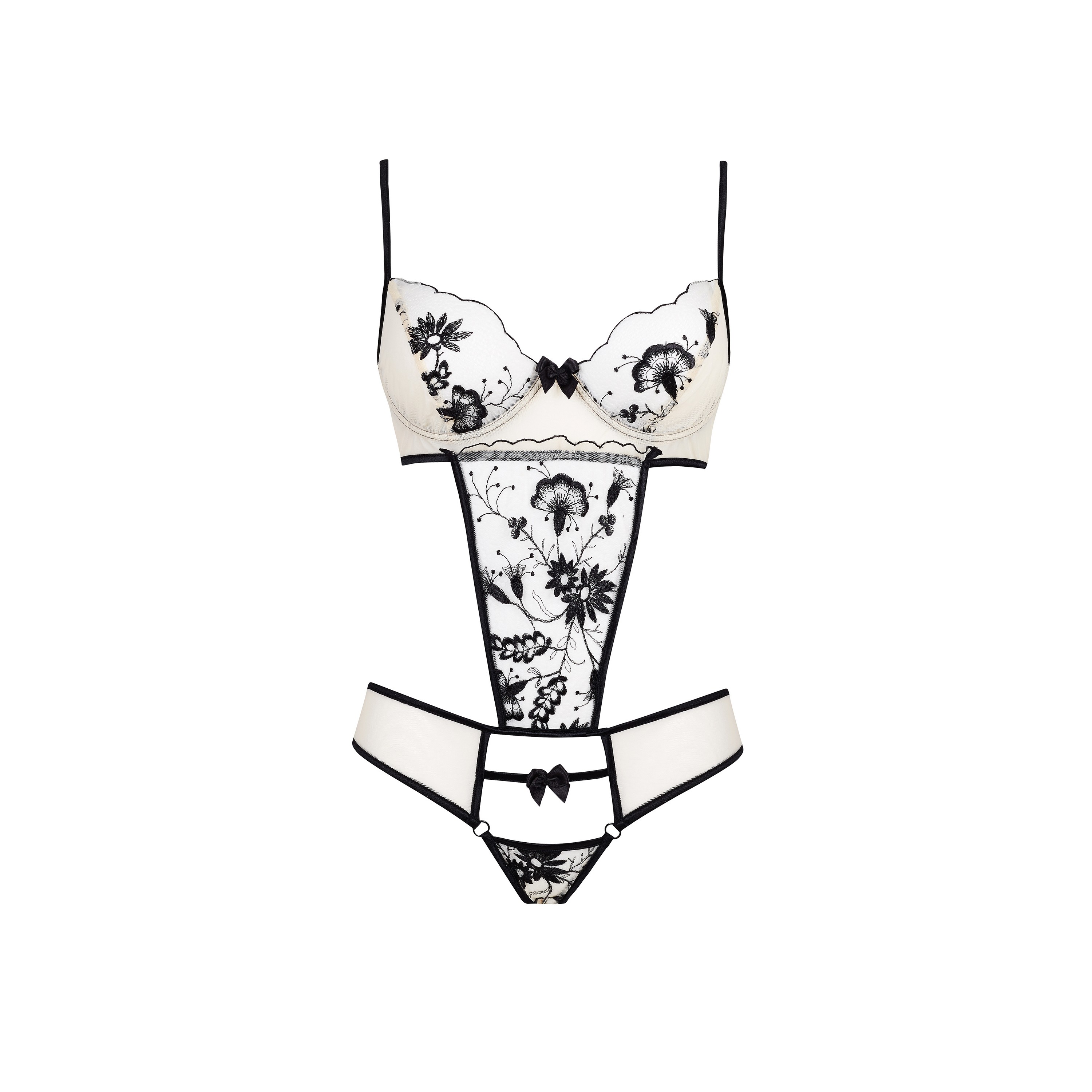 Très exclusif mais à la fois sensuel et provocateur, ce teddy exclusif est composé d'une broderie florale originale en forme de tatouage sur un tulle nude. Les bordures noires ajoutent du charme à l'ensemble. La découpe de la culotte avec un nœud décoratif.