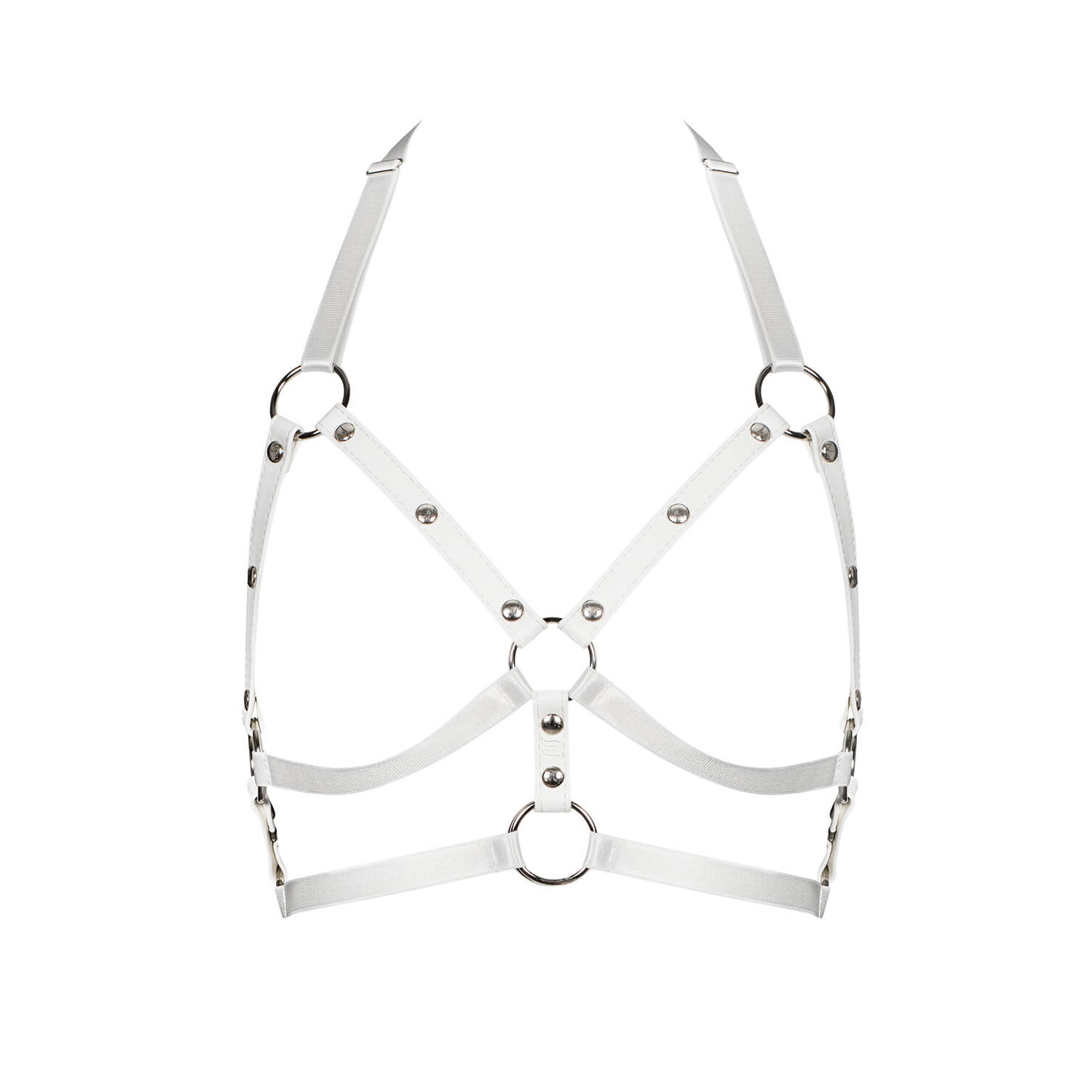 Copricapo A759 estremamente elegante con finiture in pelle è così seducente! Vestilo con piacere e sentiti sensuale. Cinghie bianche, anelli d'argento allettanti e un aspetto spettacolare: una tale combinazione riscalderà l'atmosfera della tua stanza!
