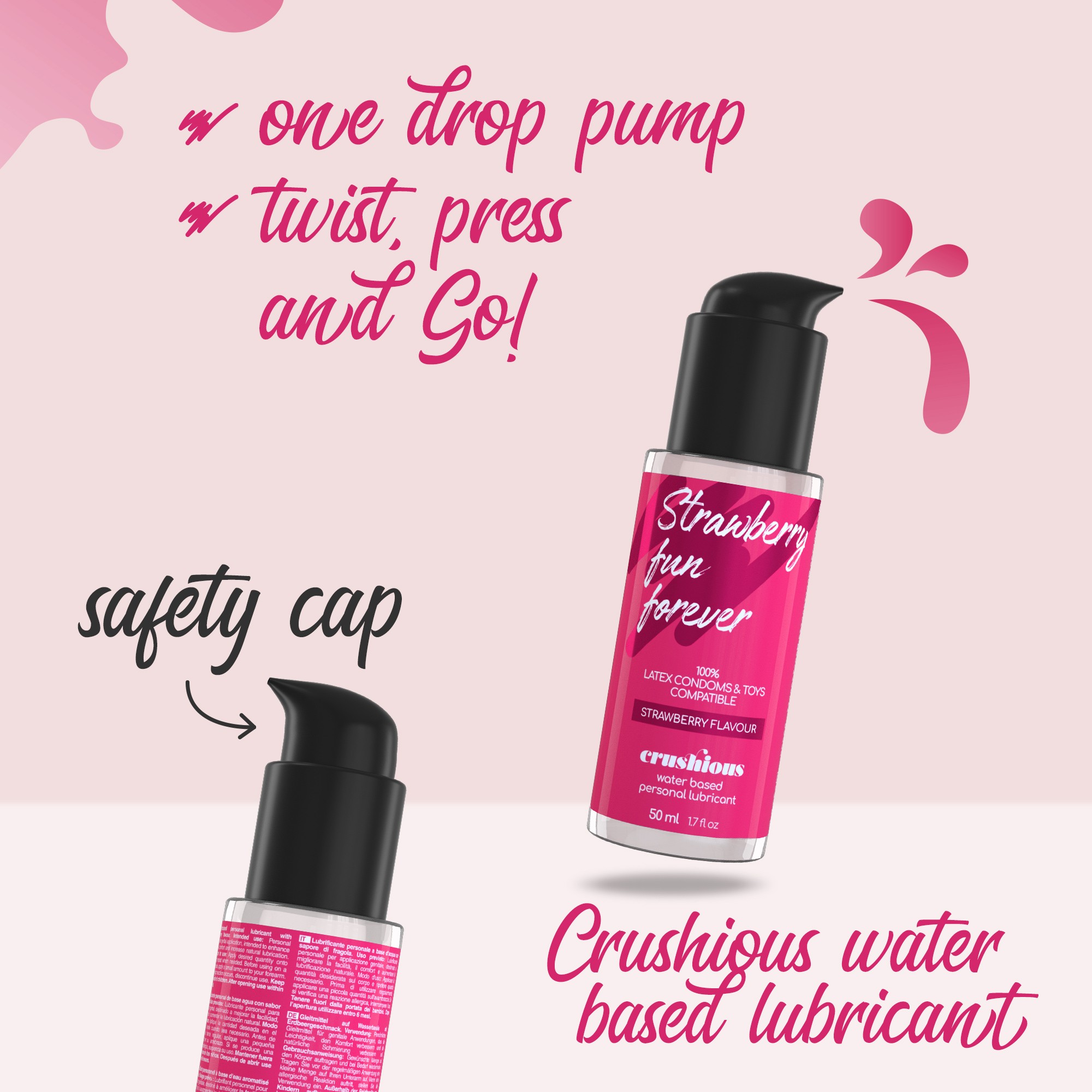 ЛубрикантыCrushious изготовлены из высококачественных ингредиентов, обеспечивающих благоприятные для кожи и гипоаллергенные ощущения. Лубриканты Crushious на водной основе безопасны для латексных презервативов и совместимы со всеми секс-игрушками.