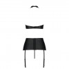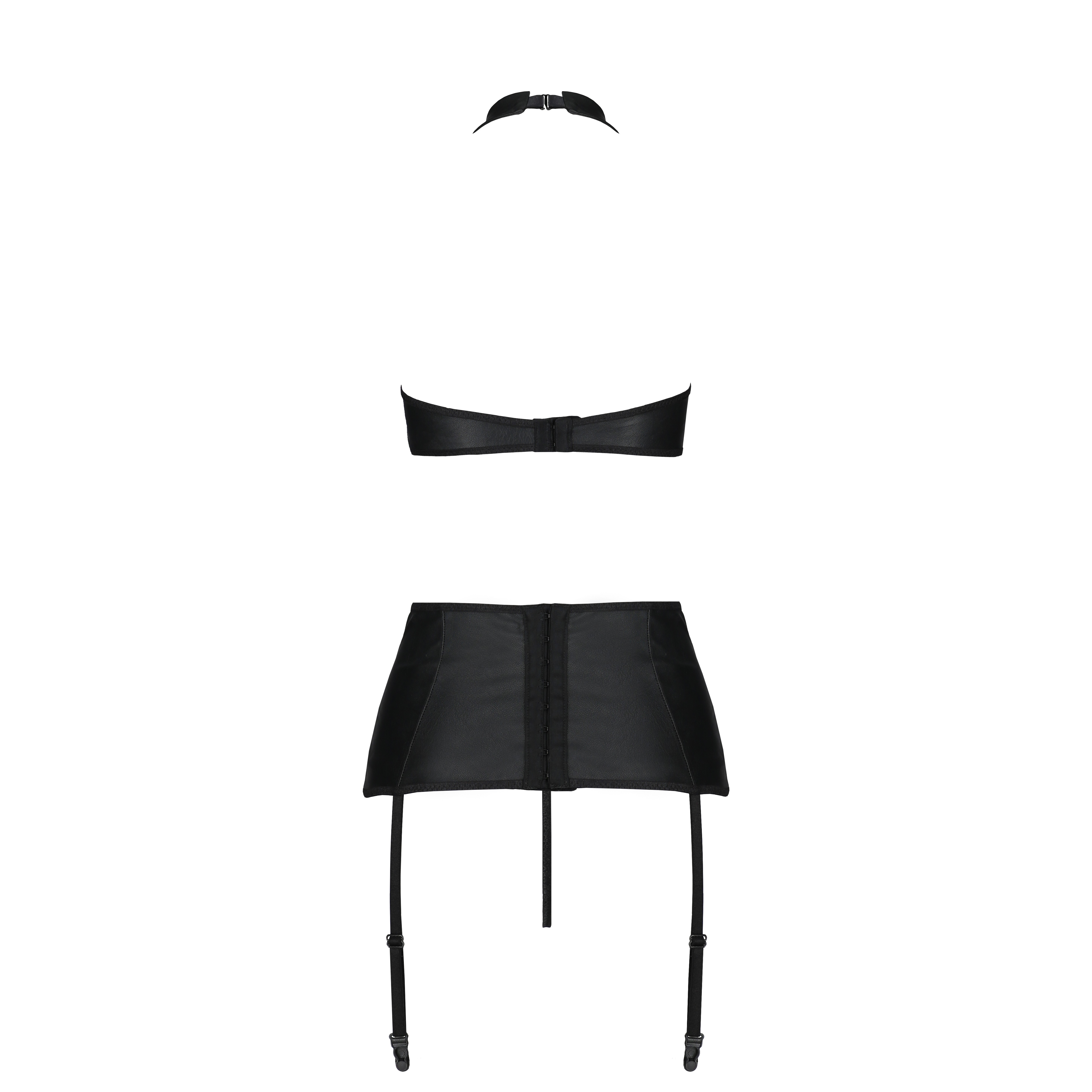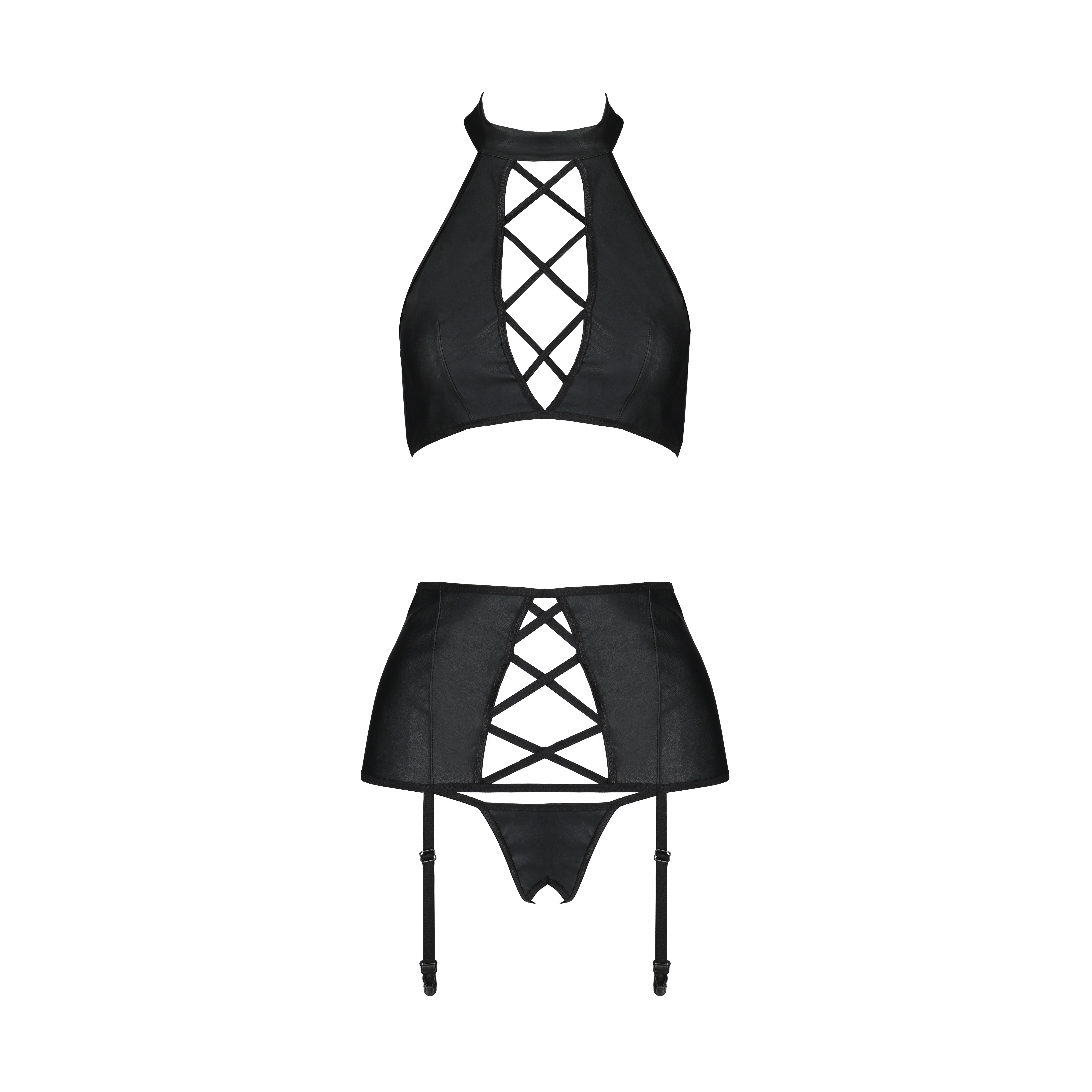 Состоящий из трех неотразимых частей, он включает в себя топ, застегивающийся на шее, пояс с подвязками и стринги смелого кроя, выполненные из высококачественной черной кожи.
